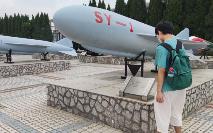 图为桂成同学去参观学习当地的中国人民解放军海军诞生地纪念馆,在纪念馆外参观导弹模型。