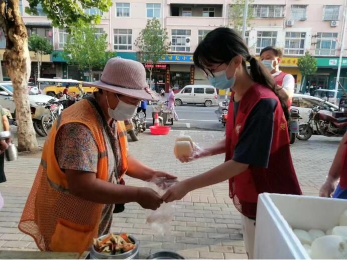 图为实践团成员为环卫工人分发早餐。