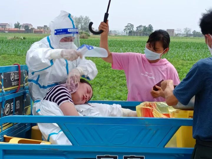 图为因天气炎热,工作人员不幸中暑,医护人员和居民采取紧急救助措施。