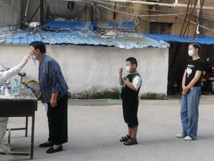 图为核酸检测现场,在志愿者的努力下,居民以安全的距离进行有序排队,核酸高效进行。