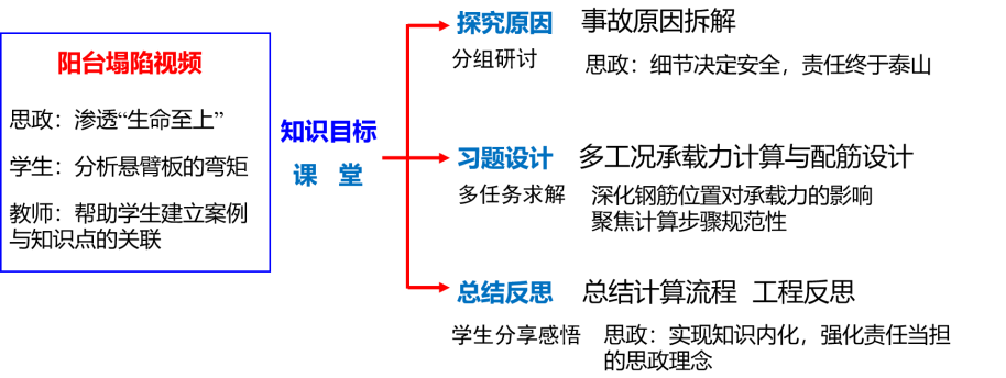 以阳台塌陷致人员遇难的真实事故为切入点,将“钢筋位置错配(顶部、中部、底部)”“使用荷载增大(加装保温层)”等事故关键诱因转化为具体计算工况。让学生在“追溯事故原因—完成多工况计算—验证承载力失效逻辑”的过程中,主动调用悬挑板弯矩分析、配筋计算、承载力验算等知识,实现“学知识为解决实际问题,用计算验证事故本质”的教学逻辑闭环。