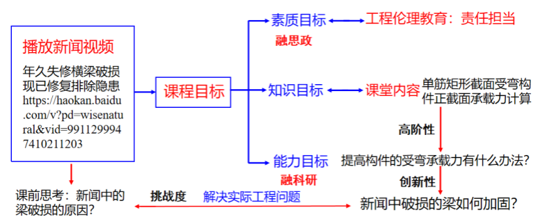 通过新闻视频,培养学生的工程思维能力,分析平台梁所处的荷载环境、工作条件与使用工况,立足混凝土材料的力学性能,以及受弯承载力的计算原则,从荷载合理性、材料匹配度、结构可靠度等多维度,系统并深入探讨视频中平台梁受弯承载力不足的根本原因,将课堂所学的理论知识,转化为解决工程实际问题的专业能力,实现学思用贯通、知信行统一“活学活用”的能力目标。
