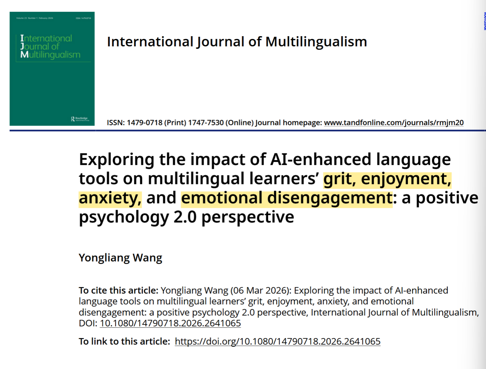 供稿:科研办公室 审核:李世杰近日,华北水利水电大学外国语学院王永亮博士以独著形式,在国际多语教育领域中国科学院一区TOP期刊《International Journal of Multilingualism》(SSCI & A&HCI双收录)发表最新研究论文。王永亮博士为斯坦福全球前2%顶尖科学家、爱思唯尔连续四年中国高被引学者,长期深耕AI赋能外语教育、二语习得与积极心理学交叉领域,在国际学术界保持着持续且稳定的影响力。本次研究以积极心理学2.0为...