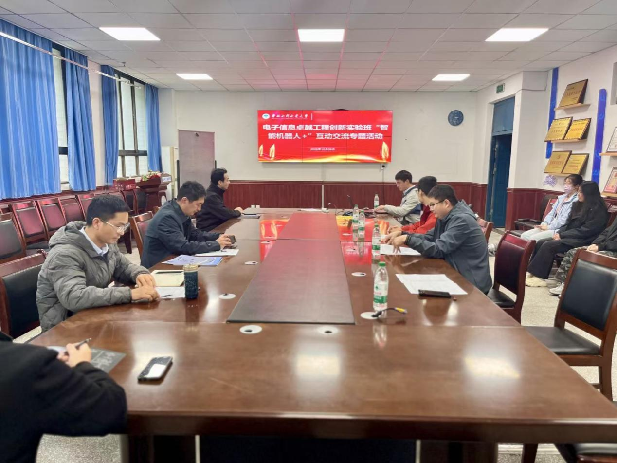 10月9日下午,电子工程学院在龙子湖校区S5-203成功举办了“智能机器人+”互动交流专题活动。此次活动旨在探索电子信息卓越工程创新人才培养新路径,引导同学们把电子信息理论基础与机器人系统、智能控制、传感技术等前沿领域深度融合,在实践中锤炼复杂工程问题的解决能力。学院领导、创新实验班科创导师、创新实验班学员、宇树科技公司代表参加会议,会议由副院长罗文宇主持。
