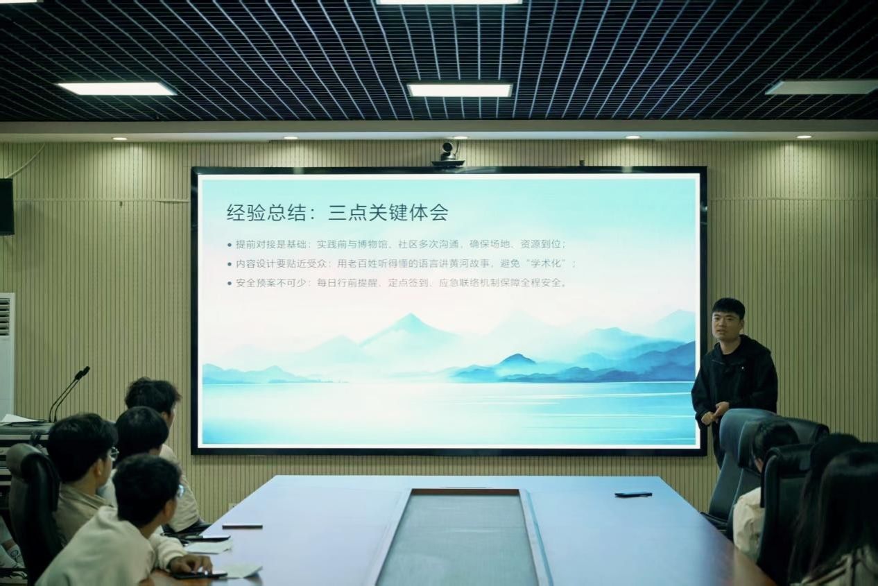 水润万物·豫水寻踪暑假实践队代表郭晨阳从六个方面进行了分享。一是项目定位,团队立足华水“水利+”特色,选择“水润中国”专题实践,聚焦黄河水文化宣传与数字化传播。二是团队构建,由15名成员组成,设有宣传组、协调组、宣讲组、后勤组。三是实践亮点,采取虚实结合、线上线下联动的方式,包括线下实地调研、社区宣讲,以及线上传播赋能。四是经验总结,强调提前对接是基础,内容设计要贴近受众,同时安全预案不可少。五是体会成长,实践活动中,华水青年为传播水文化贡献了力量,自身能力也得到提升,对黄河精神有了更深刻的体会。