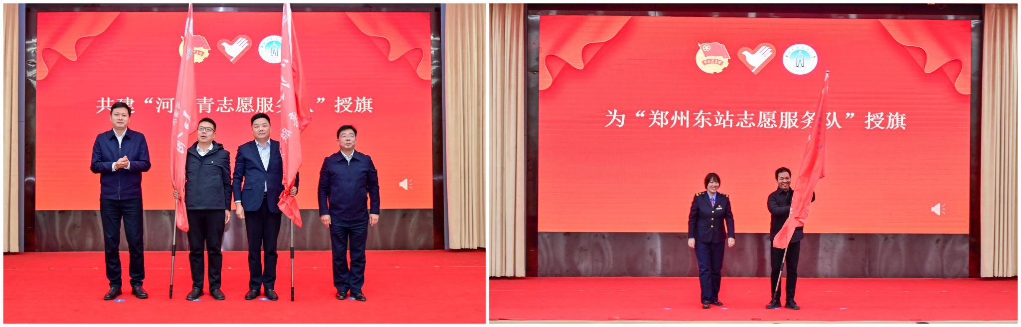 与会领导为共建“河小青志愿服务队”、“郑州东站志愿服务队”授旗