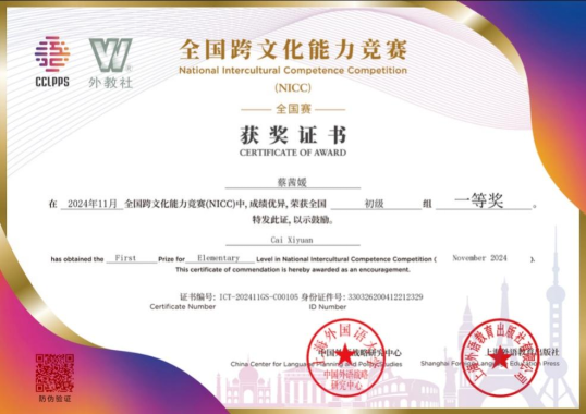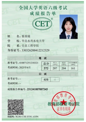 个人简介:蔡茜媛,女,中共预备党员,华北水利水电大学信息工程学院计算机科学与技术专业2023级2023179班学生。在校期间综合表现优异,大二学年专业成绩位列第三,大学英语四级569分、六级572分,荣获全国英语跨文化能力考试初级国家一等奖,并获评国家奖学金、优秀学生干事、三好学生等荣誉称号。