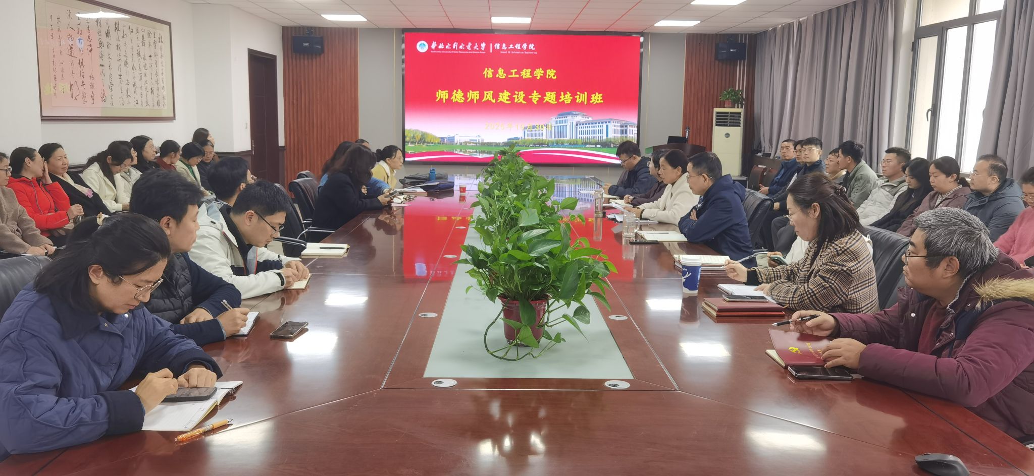 2025年10月30日下午,华北水利水电大学信息工程学院在龙子湖校区新综合楼中栋501会议室隆重召开师德师风建设专题培训班会,学院全体教职工齐聚一堂,共同深入学习党的十八大以来习近平总书记关于师德师风的重要论述,为学院教育事业高质量发展筑牢师德根基。