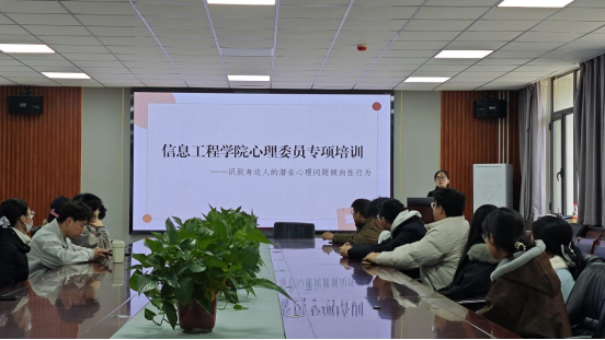 为提升班级心理委员的专业素养与朋辈互助能力,筑牢学院心理健康防线,3月13日,信息工程学院在501会议室举办了以“识别身边人的潜在心理问题倾向性行为”为主题的心理委员专题培训。学院全体班级心理委员及部分宿舍长代表参加了此次培训。
