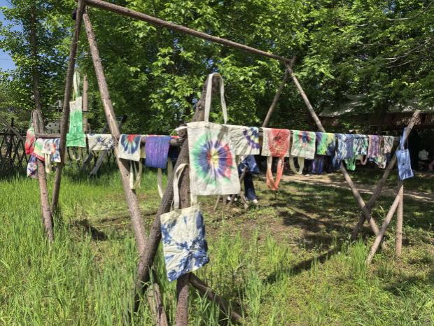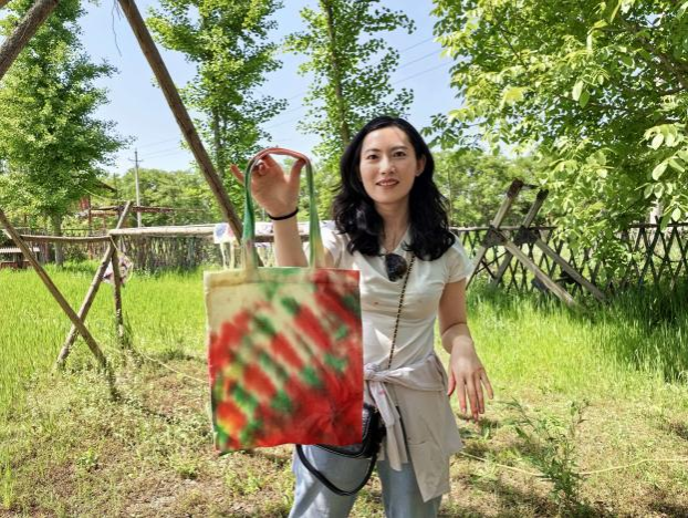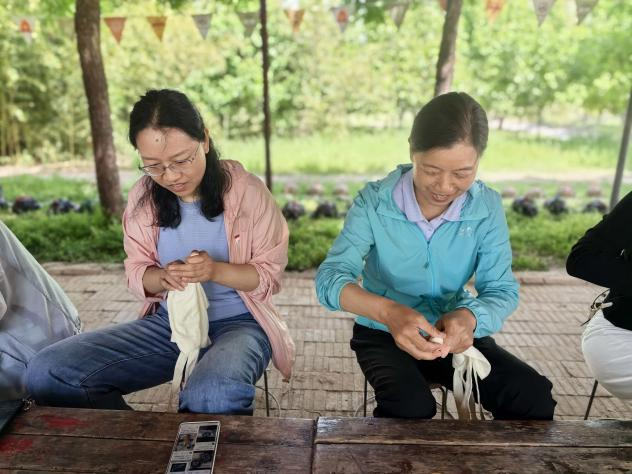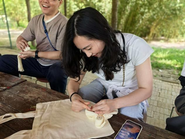 下午,教职工们抵达荥阳国盛农业生态园,开启了非遗手工体验与趣味团队拓展之旅。首先进行的是传统扎染手工体验,教职工们兴致勃勃地动手实践。通过捆扎、浸染、晾晒等工序,将普通的白布包变成了一幅幅图案各异、色彩斑斓的扎染作品。在亲手创作的过程中,教职工们沉浸式感受了中国传统非遗技艺的独特魅力,收获了满满的成就感与创作乐趣。