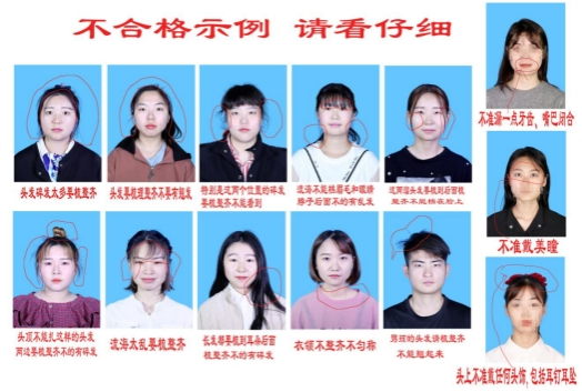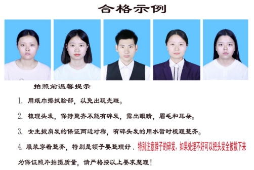 5、请各学院通知到每位学生,采集图像前需整理好个人形象。因为本次采集运用超清设备采集图像,头发一定要梳理整齐,眼睛眉毛耳朵需露出来。长发扎起或披到肩后,把短发、碎发梳理整齐,不要有乱发、翘发。在拍照时注意:(1)切勿穿浅蓝色衣服;(2)切勿佩戴耳环、耳钉及一切耳部装饰;(3)切勿戴眼镜及美瞳;(4)切勿用头发遮挡眼睛、耳朵;(5)嘴巴自然闭合,请勿露出牙齿;(6)严禁化妆,必须素颜采集。如果因化妆问题导致后期学信网人像比对不通过,后果自负。