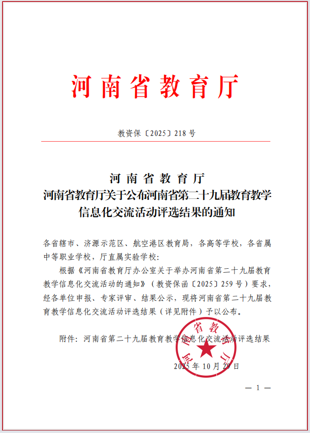 近日,河南省教育厅正式发布了《河南省教育厅关于公布河南省第二十九届教育教学信息化交流活动评选结果的通知》(教资保函〔2025〕218号),凭借扎实的教学创新能力和信息化技术应用水平,我校在本次赛事中表现突出,共荣获14个奖项,其中,高等教育组微课荣获一等奖2项、二等奖3项、三等奖4项;高等教育组信息化教学课程案例荣获二等奖2项、三等奖2项;高等教育组优秀教育电视节目荣获三等奖1项。