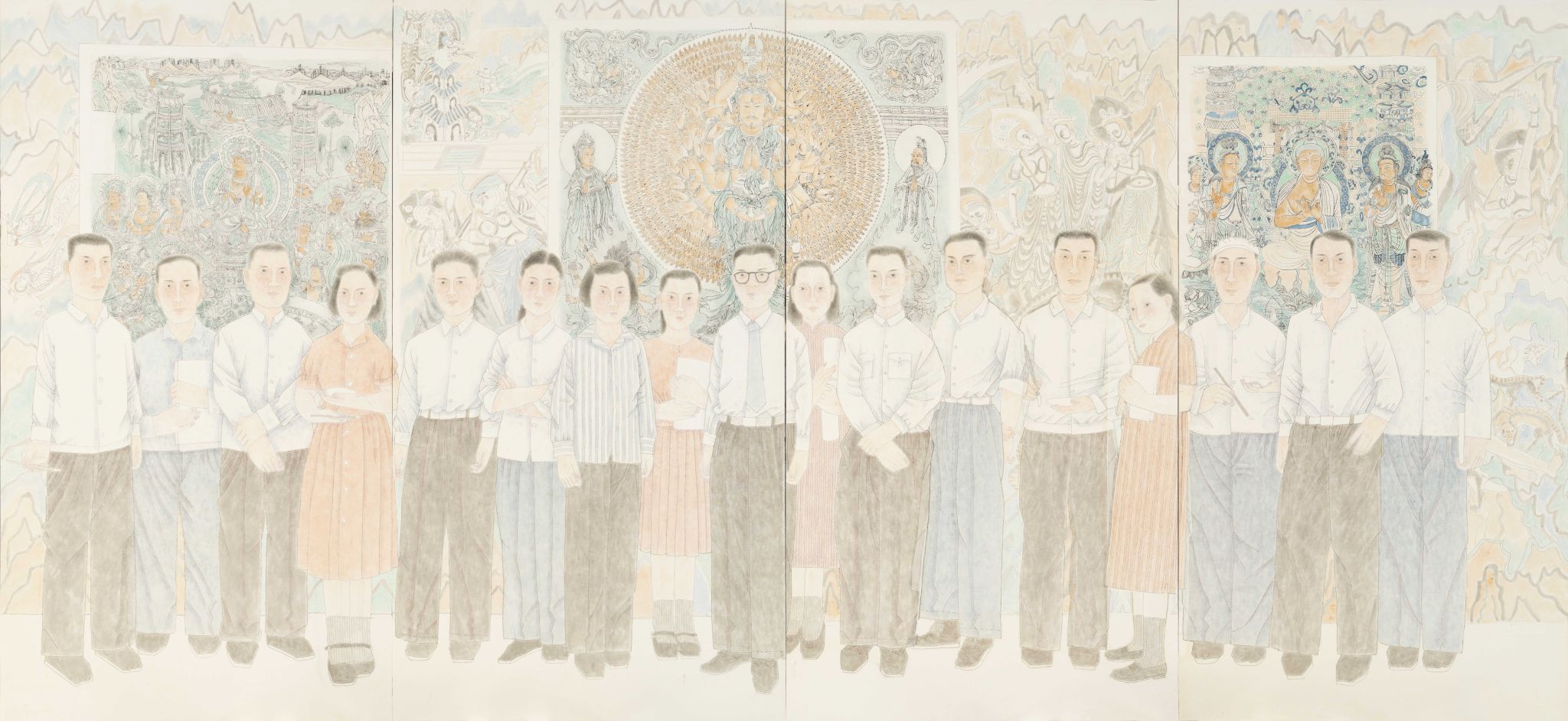 该壁画作品描绘了常书鸿、段文杰、樊锦诗、李云鹤、孙纪元、李复、霍熙亮、史苇湘、欧阳琳、李承仙、常沙娜、李其琼、孙儒僩、万庚育、关友惠、贺世哲、冯仲年17位艺术工作者,他们坚守大漠、保护莫高窟艺术,把毕生的精力都奉献给了敦煌事业。这幅壁画不仅是对17位艺术工作者个体贡献的致敬,更浓缩了一代又一代敦煌人的精神底色——那是对民族文化的敬畏与热爱,是甘于寂寞、无私奉献的坚守,是让千年敦煌重焕光彩的责任担当。