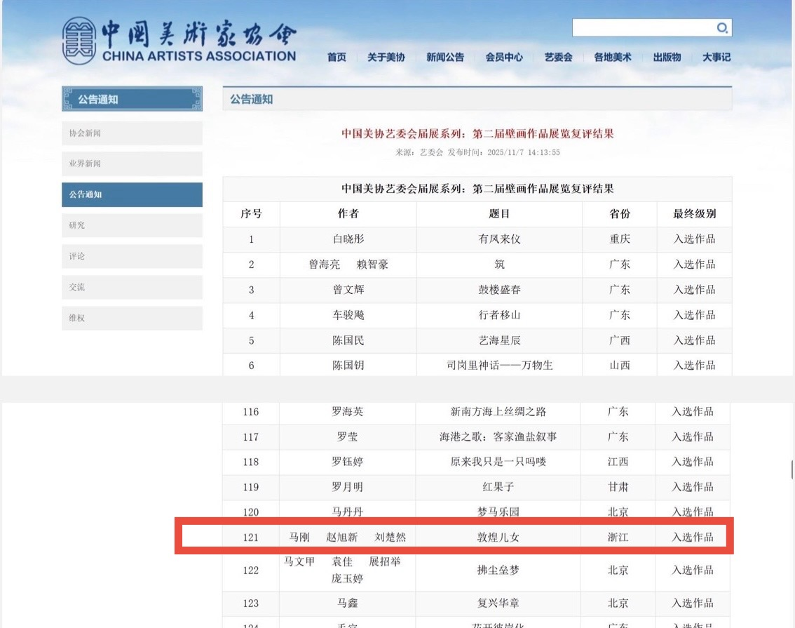 本届“中国壁画作品展览”作为中国美协艺委会打造的重要学术品牌,聚焦“制造美学”、新质生产力与传统文化传承等时代主题,是当代壁画艺术领域的重要学术平台。展览自启动征集以来,共收到全国投稿1252件,经严格评审,最终入选作品257件。我院教师马刚的壁画作品《敦煌儿女》(170cm×360cm)成功入选,成为展现当代壁画艺术水准的代表性作品之一。
