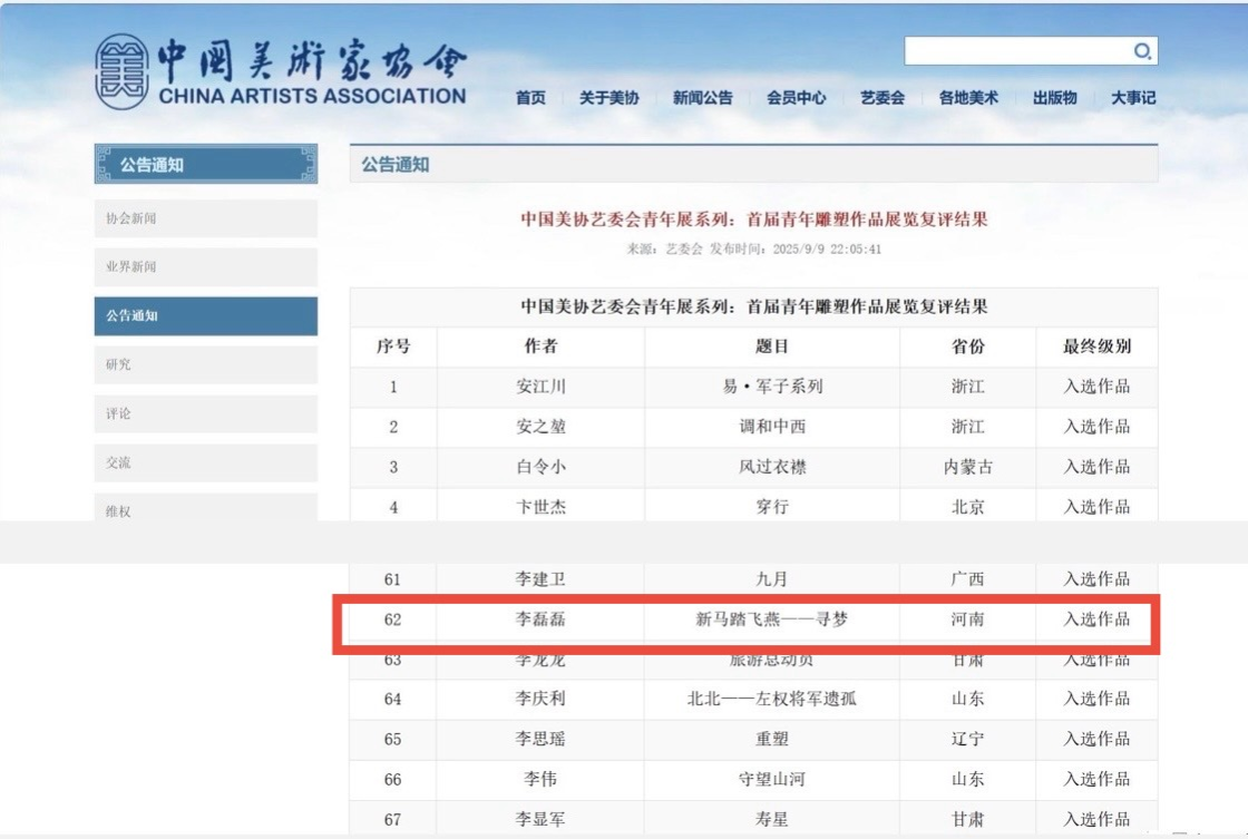 “首届青年雕塑作品展览”作为中国美协艺委会青年展系列的重要项目,旨在发掘与培育青年雕塑力量,推出体现时代气息与中华特色的精品力作。展览共收到全国投稿1276件,经严格评审,最终263件作品入选。我院教师李磊磊作品《新马踏飞燕——寻梦》凭借独特的艺术构思与深刻的文化内涵成功入选。