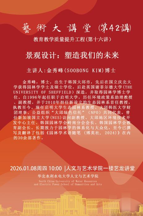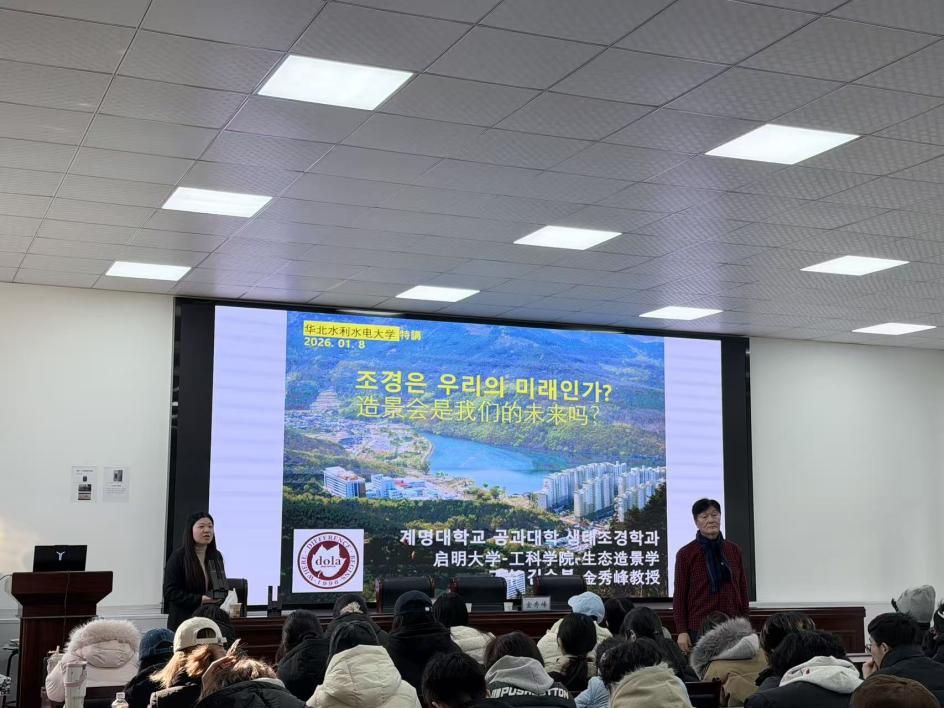 2026年1月8日上午,韩国启明大学生态园林系首任教授金秀峰(Soo Bong Kim)受邀在华北水利水电大学人文与艺术学院,作题为“造景艺术与人类未来”的专题讲座。讲座围绕六大核心议题展开,以国际化视角深入解读造景行业的发展趋势与人文价值,吸引众多师生参与交流。