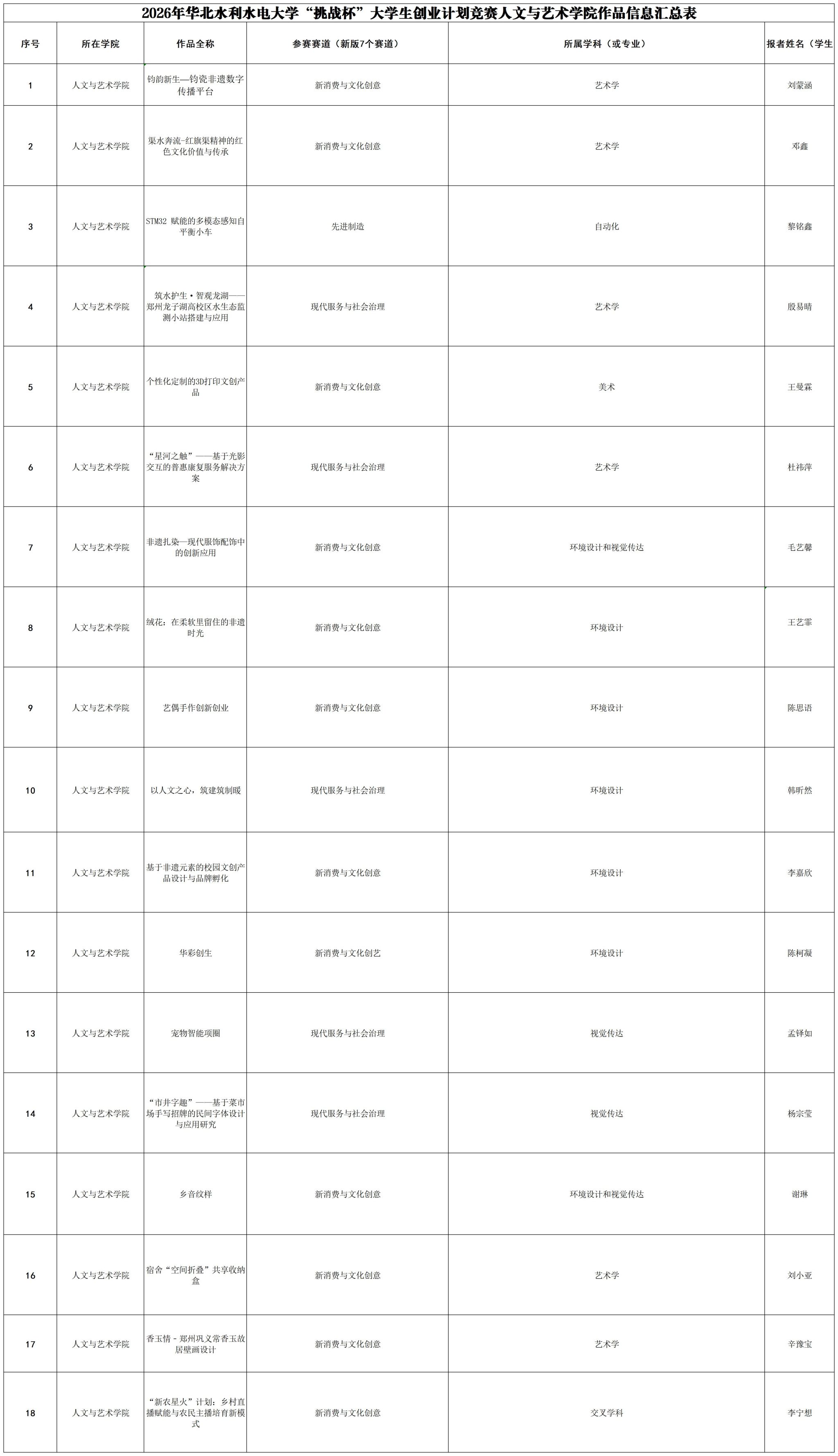 2026年华北水利水电大学“挑战杯”大学生创业计划竞赛人文与艺术学院作品信息汇总表公示