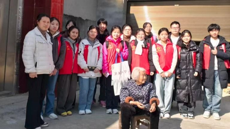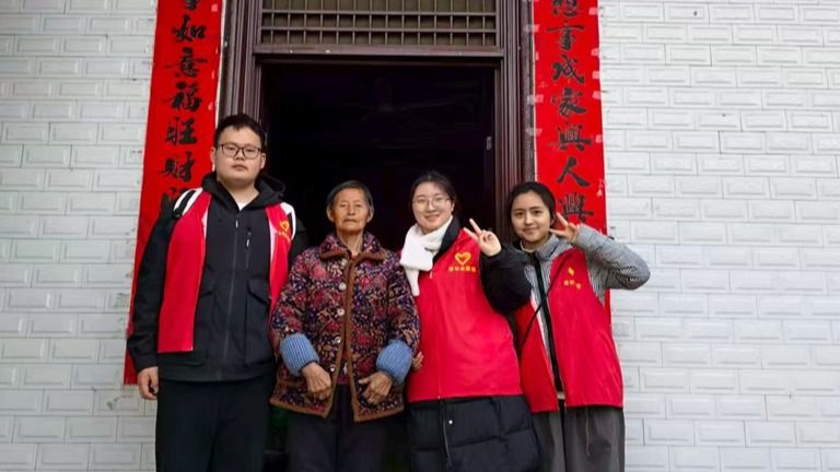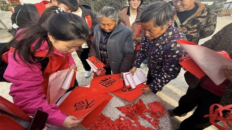 走访途中,见到一些重病缠身的爷爷奶奶,但他们没有被病痛和孤独打倒。一位百岁奶奶,独自生活,却精神矍铄。老人们的热情更让我动容。一进门,就招呼我们坐下喝水,把板栗一个劲往我们手里塞,念叨着“新年快乐”。我们送上亲手剪的窗花、写的春联,他们眼里泛起笑意。那一刻我忽然懂得:这从来不是单向的给予,而是双向的奔赴。老人们用坚韧告诉我:生命的力量,不在于拥有多少,而在于无论拥有多少,都能把日子过得热气腾腾。