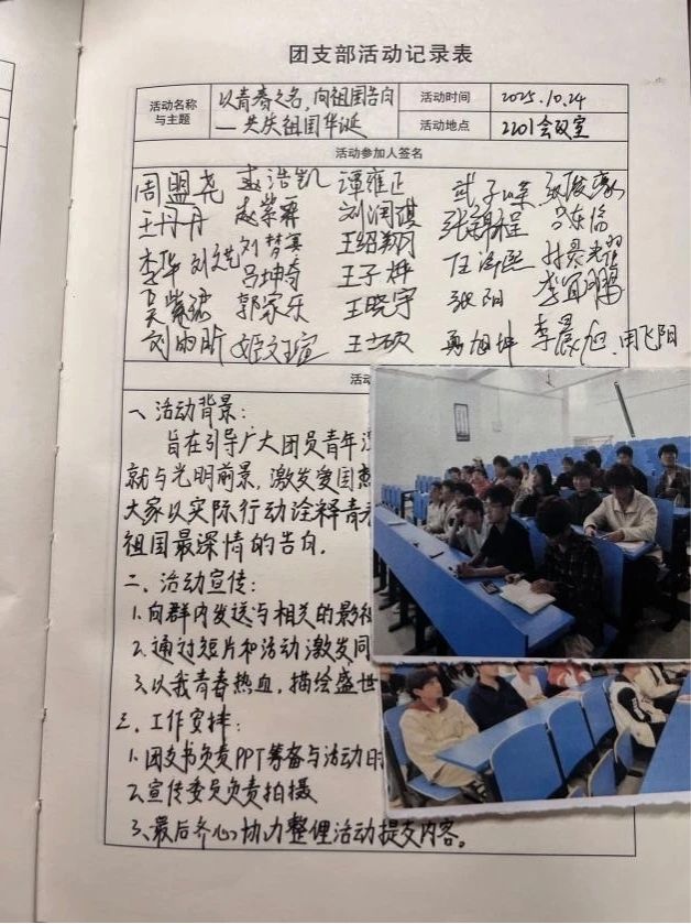 2025206班团支部以“走进小课堂”为载体,精心策划主题班会,不仅组织观看了有关汪胡桢先生生平与贡献的纪录片和影像资料,并开展深入研讨,还在共同告白祖国、共庆华诞的过程中,增强团组织的凝聚力与号召力,强化团员的组织归属感,激发团组织的青春活力。