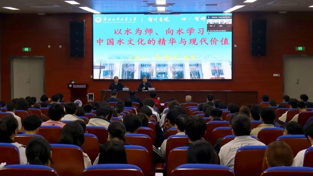 为了传承水文化、弘扬水的精神,进一步彰显华北水利水电大学缘水而生、因水而存、籍水而兴的特色,强化师生的文化认同和文化自信,11月6日下午,智川书院特邀我校原党委书记、华北水利水电大学水文化研究中心朱海风教授在江淮校区作题为《以水为师、向水学习——中华水文化的精华品类及其现代价值》的学术报告。报告会同步开通线上直播,吸引了众多师生共同聆听。报告会由智川书院院长饶明奇主持。