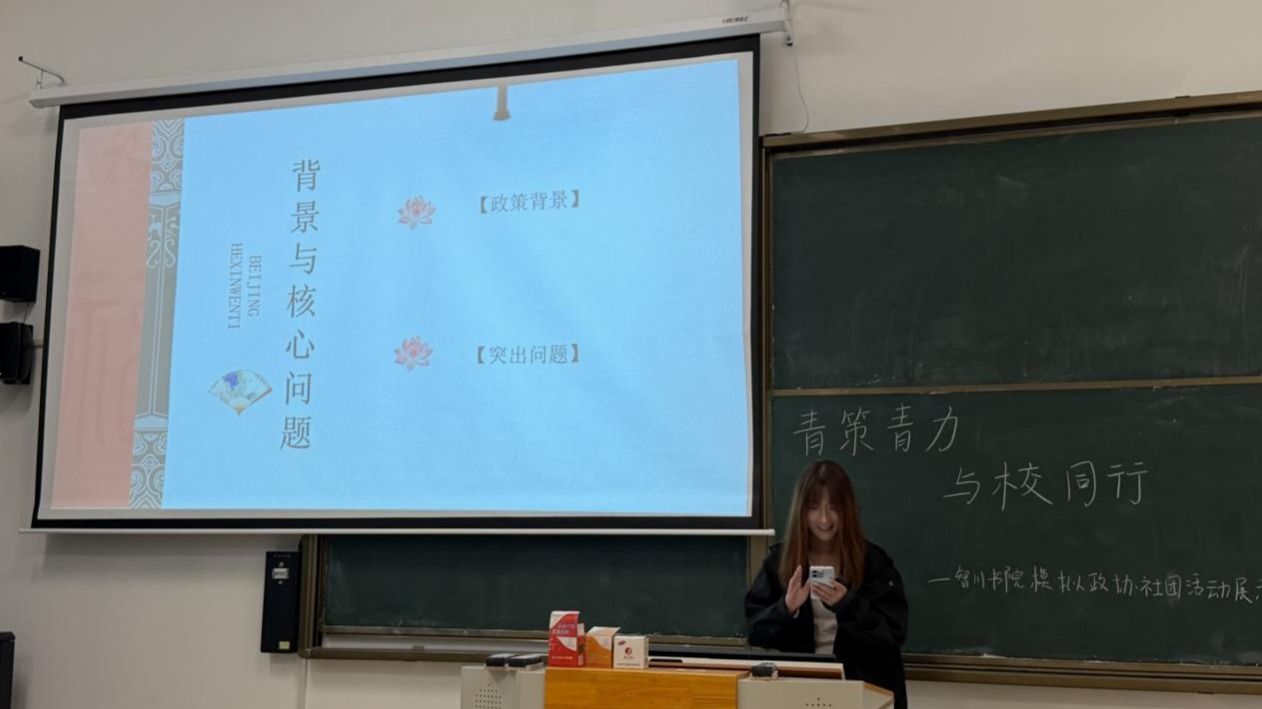 为了提升学生的议政素养与社会责任感,华水大学智川书院模拟政协社团于11月16日在4401教室开展议政活动。本次组织十余名同学分别以三个时政主题开展演讲活动,为社会热点问题贡献青年力量。