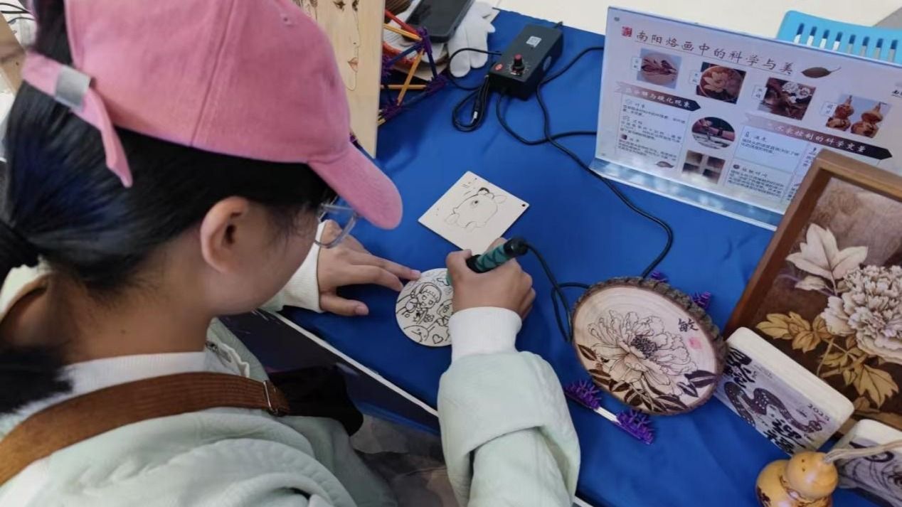 周景堂先生握着我的手腕,运笔如蛟龙潜泳。目光落到他指尖细密的伤疤,那大抵是六十余载与烙铁“较劲”的勋章。待我独自尝试,木板上逐渐多出许多黑黢黢的小坑。“快落快起”“纹理木纹”,我仿佛看到了十年如一日的匠人精神。从过去宫廷贡品到如今视频圈粉,从老辈以扦代笔到如今融玉雕纹,烙画的传承从未停滞。非物质文化遗产从来不是被遗忘的“老物件”,它是中国人的文化根基。