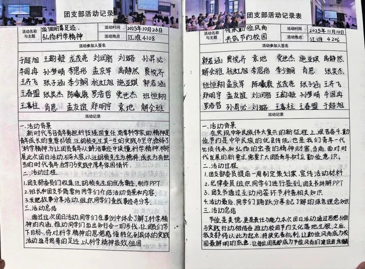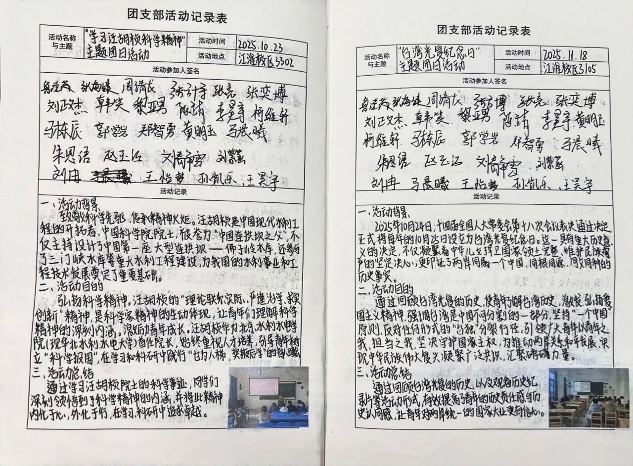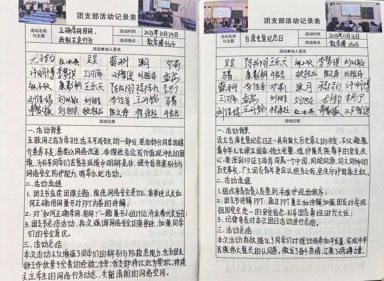 本次主题团日活动紧扣历史传承、思想引领、实践育人三大核心,以多元创新形式为载体,助力团员青年深化思想认知、强化责任担当、践行文明风尚。活动中,同学们在回望台湾光复壮阔历程中厚植家国情怀,增强维护国家统一的使命自觉;在深学细悟党的二十届四中全会精神中坚定理想信念,明晰跟党奋进的时代方向;在躬身践行勤俭节约中涵养传统美德,为节约型校园建设注入青春动能。此次活动实现了思想引领与实践育人的深度融合,不仅让团员青年在沉浸式参与中锤炼品格、增长才干,更推动责任担当从思想自觉转化为行动自觉,将持续激励同学们以奋斗之姿勇担时代使命,用实干实绩书写无愧于青春、无愧于时代的合格答卷。