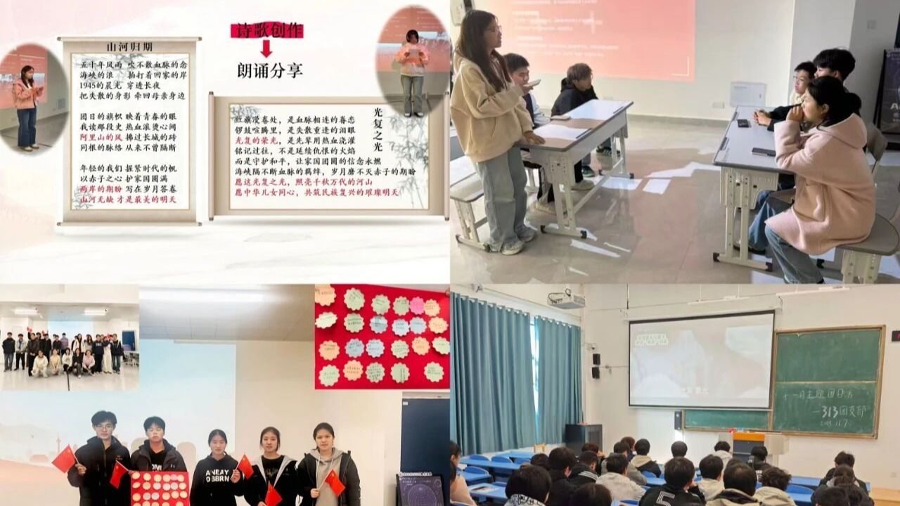 为让历史学习鲜活起来,各团支部巧设“诗、辩、愿”三重趣味活动,让厚重历史可感可触:组织举办“原创诗歌” 朗诵会,同学们以声情并茂的演绎为载体,向师生真挚传递家国深情;围绕“台湾光复的意义”开展辩论赛,参赛团员引史论今、各抒己见,在思想交锋中明晰青年使命与时代方向;精心制作“多彩心愿墙”,团员们的铮铮誓言与创意手绘交相辉映,同步搭配历史影像展与知识寻宝赛等配套活动,让抽象的历史知识变得具体可感。