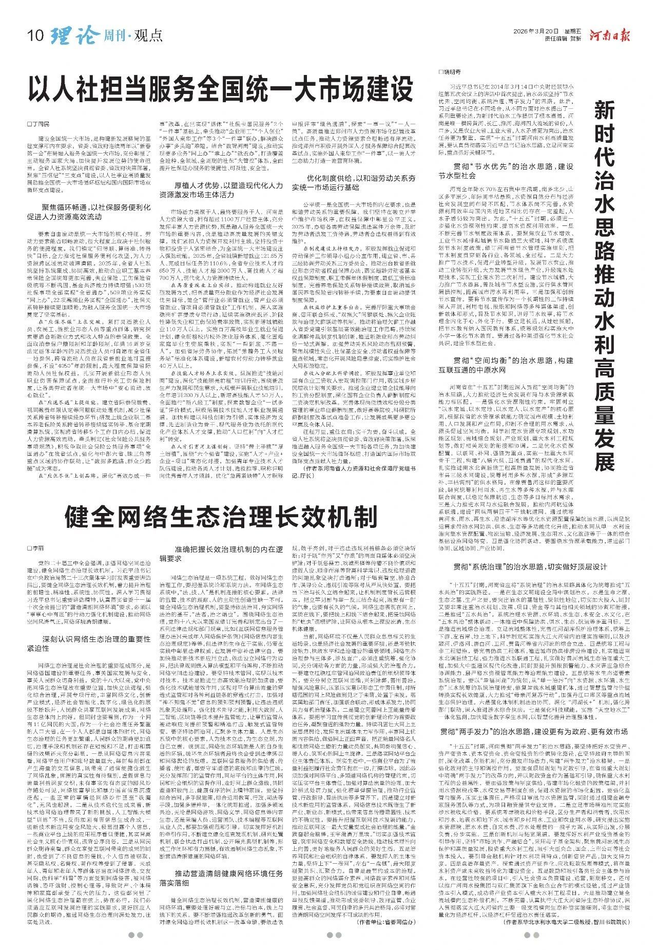 编者按:3月20日,《河南日报》理论版刊发我院院长饶明奇署名文章《新时代治水思路推动水利高质量发展》。文章立足省情系统阐释治水思路的河南实践,围绕节约优先、空间均衡、系统治理、两手发力四个方面展开论述,提出务实路径与对策建议,兼具理论深度与实践价值。