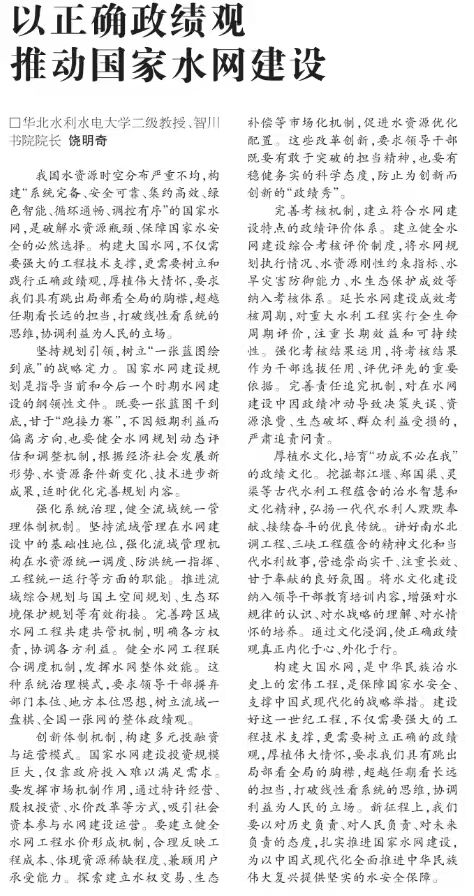 编者按:国家水网建设事关国计民生、水安全保障与长远发展,是中国式现代化的重要基石。4月14日,《中国水利报》刊发我院院长饶明奇署名文章《以正确政绩观推动国家水网建设》。文章立足治水实践与理论思考,围绕以正确政绩观推动国家水网建设撰文阐释,强调胸怀全局、着眼长远、系统治理、为民造福,为高质量推进国家水网建设提供学理支撑与实践启示。