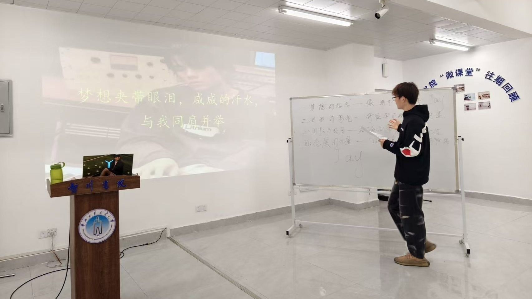 随后,主讲人杜培焱围绕“信念如《蜗牛》般坚持”、“勇气如《双截棍》般创新”、“格局如《同一种调调》般协作”、“态度如《不能说的秘密》般认真”四个维度展开分享。在理论讲述环节,他结合周杰伦的成长经历、经典作品MV及励志歌词,生动阐释了坚持梦想、勇于突破、团队合作与精益求精的精神内涵;在案例分享环节,他将自身在人工智能专业学习中获得国家奖学金、参与新铁军训练、以及在党政办公室与融媒体中心的实践经历与歌词精神相印证,使抽象的品质转化为具体、可感的学习与行动指南,深深吸引了在场同学。
