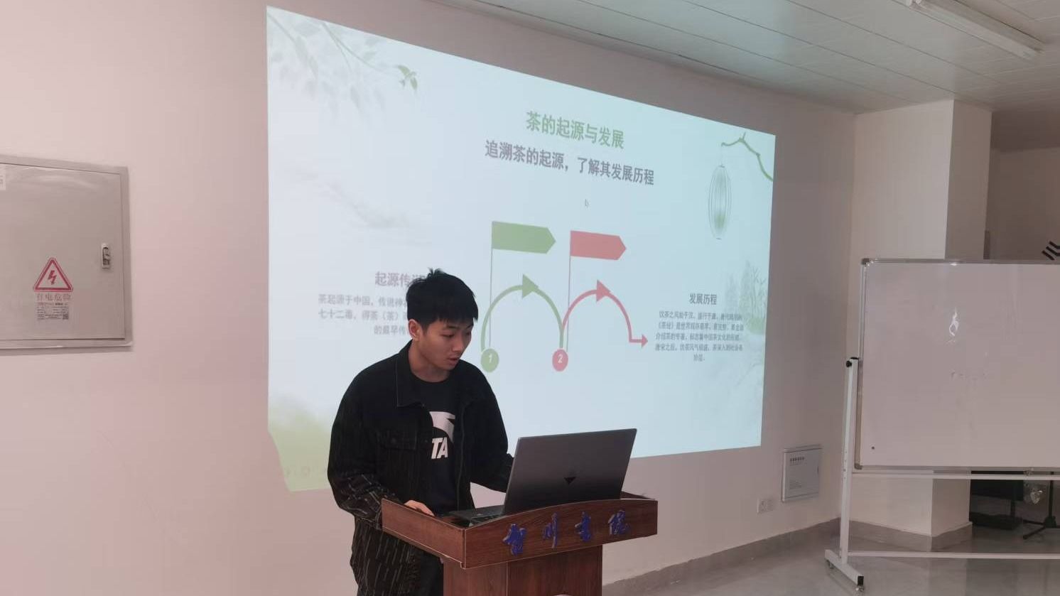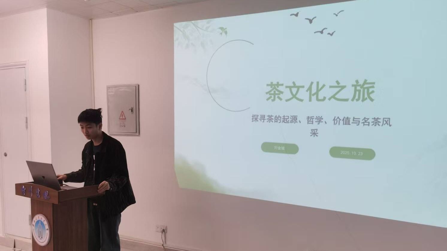 10月23日下午,智川书院举办了第二期学生微课堂“茶文化之旅”分享活动。主讲人:刘金坡。活动以深厚的茶学底蕴与人文情怀为脉络,带领现场听众穿越千年茶史,探寻茶的起源、哲学意蕴与文化价值,纵览中外名茶风采,打造了一场集知识性、审美性与哲思性于一体的茶文化盛宴。