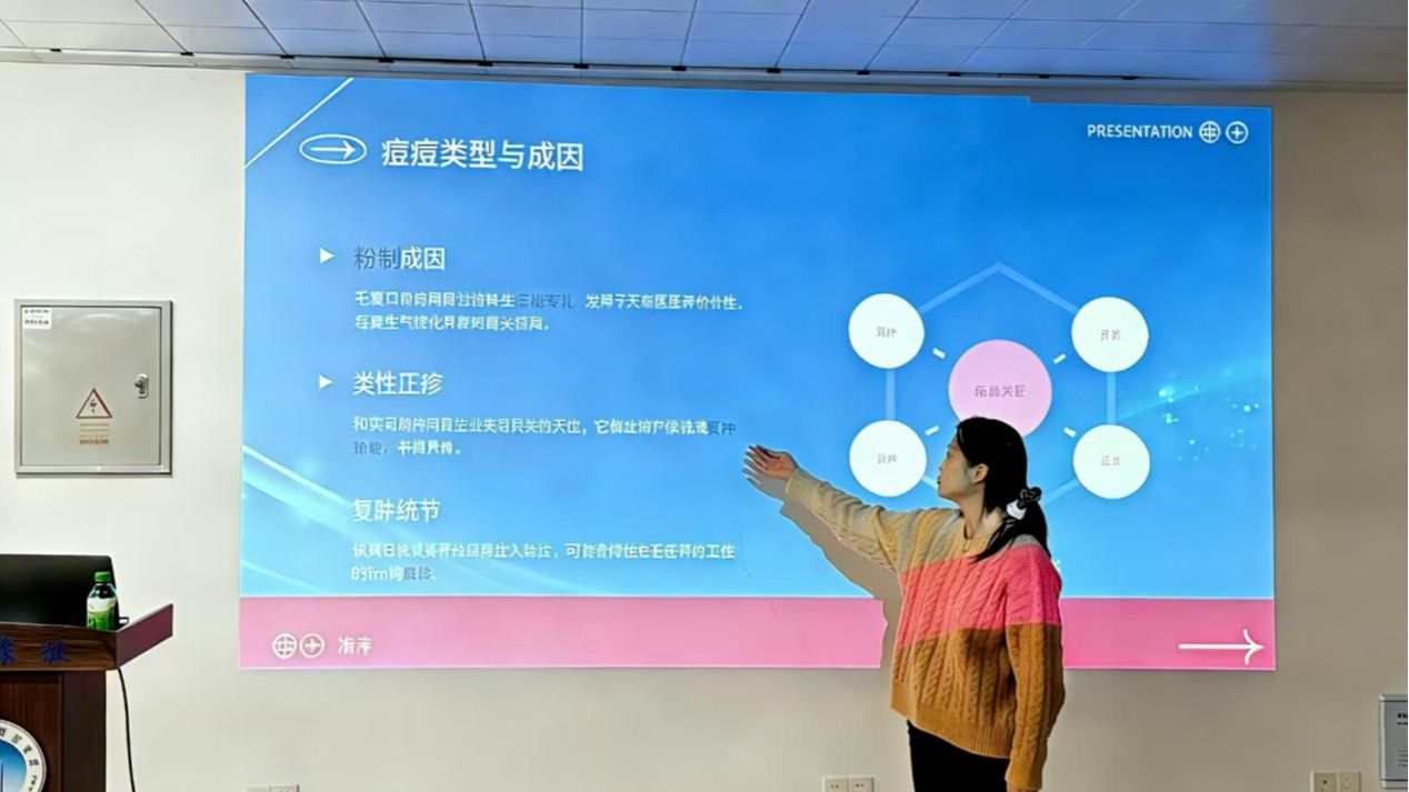 讲座开场,路涛向大家介绍了常见护肤问题的基础常识:通过图文对照区分粉刺、丘疹等痘痘类型,用生活案例解释紫外线、清洁不当引发的色素沉着问题,借助通俗的语言让在场同学快速了解肌肤问题的常见诱因。
