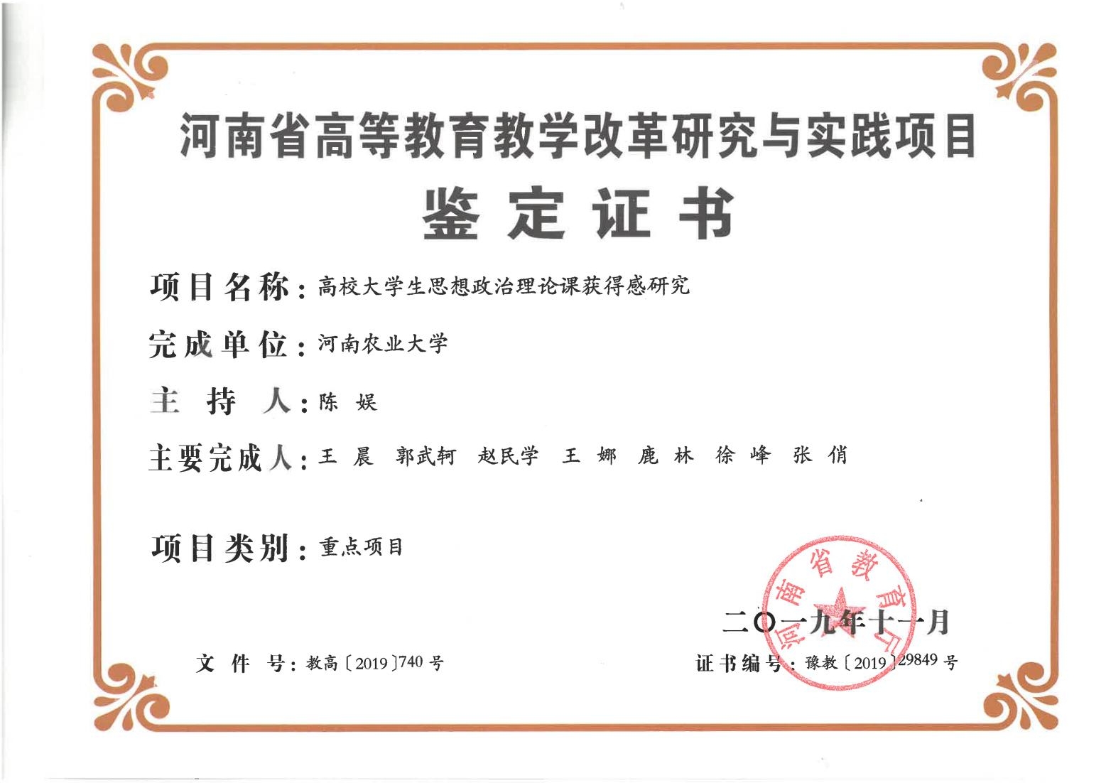河南省高等教育教学改革研究与实践项目:高校大学生思想政治理论课获得感研究(河南农业大学,2019年)