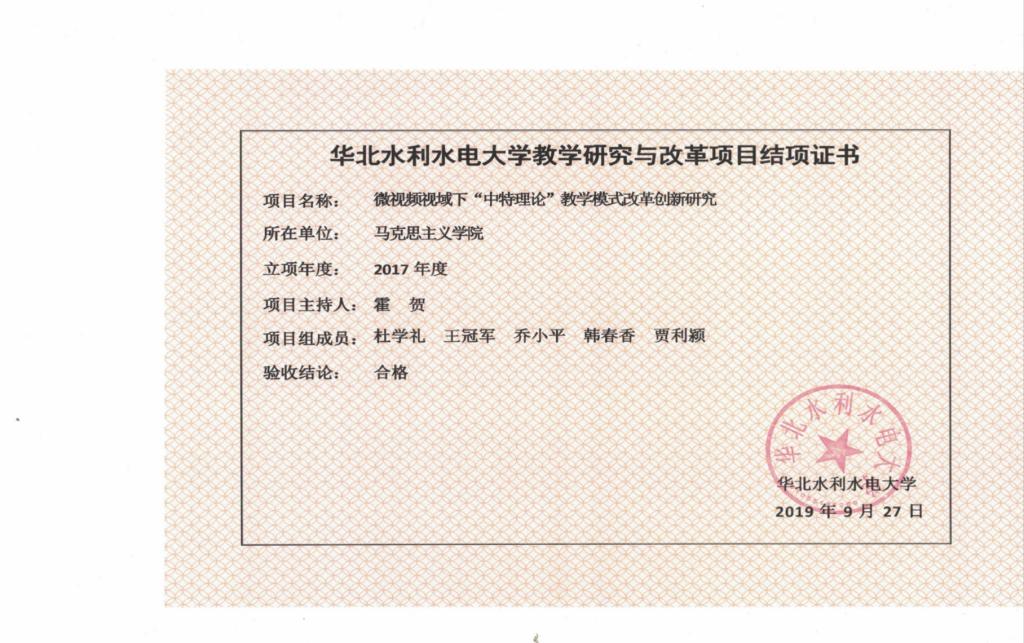 华北水利水电大学教学研究与改革项目:微视频视域下“中特理论”教学模式改革创新研究(2019年)